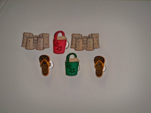 Building Sandcastles: Set of 6 Includes two sandcastles,two buckets filled with sand, and two flip flops. Sandcastles measure 1 1/8" x 3/4" x 1"Made of nylon material attached to a clear push pin with a strong adhesive glue for many years of useNote: Each push pin stands away from the wall or board. They do not lay flush.